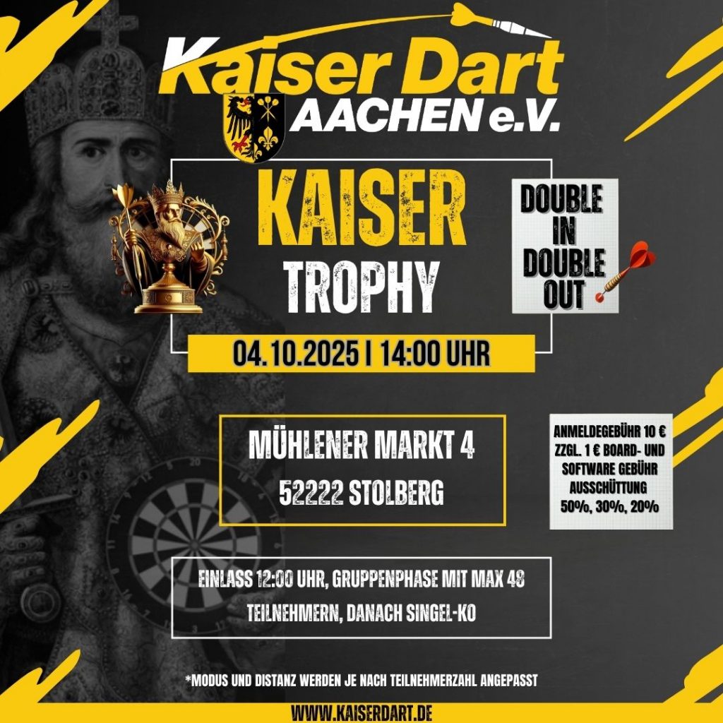 Zur Einstimmung auf den World Grand Prix der PDC richten wir am 04.10. unsere diesjährige Kaiser Trophy aus. Auch bei uns geht es im Modus Double In – Double Out um die Preise.