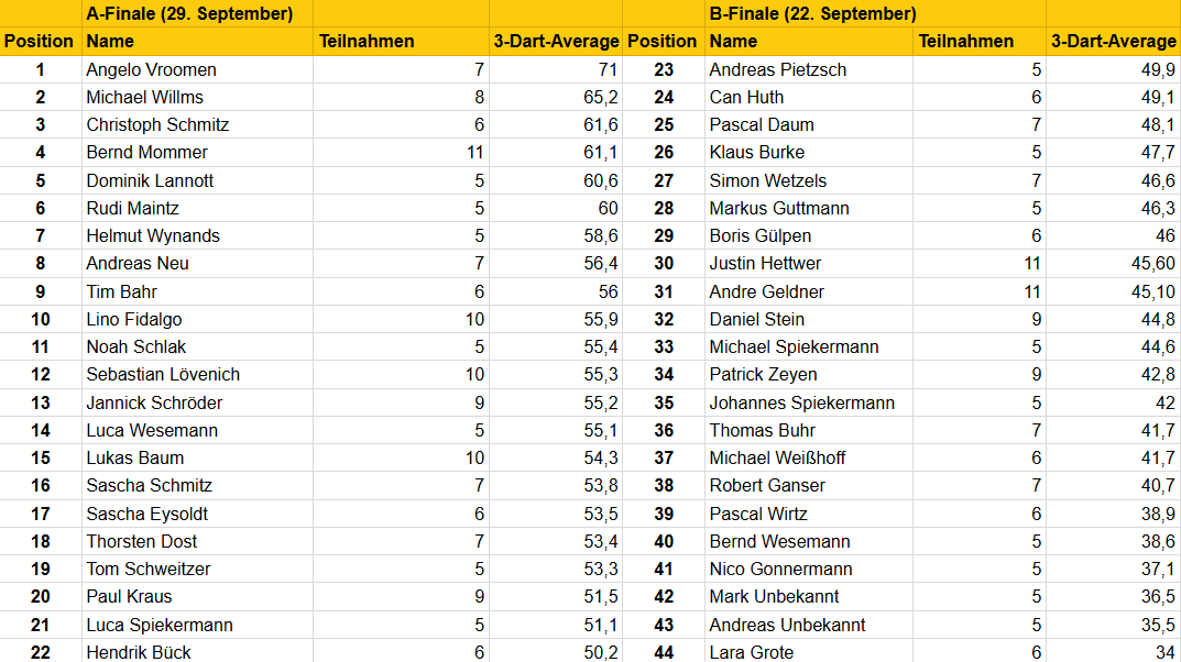 Folgende Spieler und Spielerinnen waren für die Finalturniere am 22.09. und 29.09. qualifiziert: